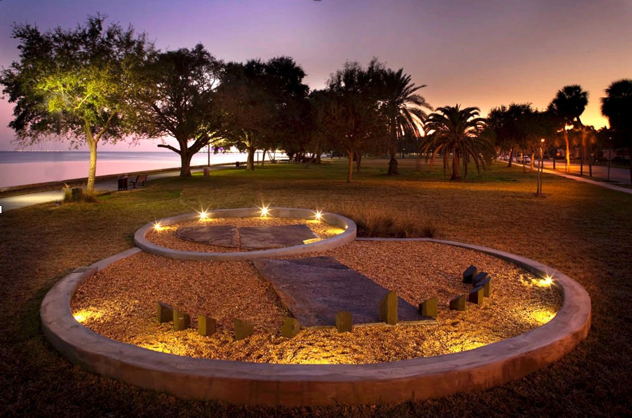 The human sundial celebrates the 100th anniversary of the Saint Petersburg waterfront park system. A semi-circle of markers, each with an hour denoted on it, is placed at ground level. When a person stands facing North in front of the circle, his or her shadow is cast upon the correct hour marker. The LED lighting element is wildlife friendly, so it doesn't interfere with animals' natural circadian rhythm.